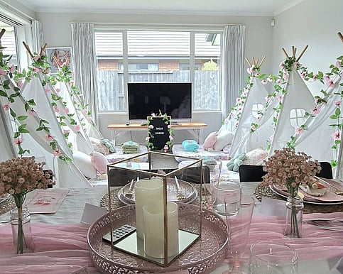 A: This depends on the layout of your home and the type of party you booked. An average bedroom will accommodate 3 teepees. Living rooms up to 6 teepees. We discuss your vision once your booking form has been received - we do ask your space is clear of furniture and floor clean prior to our arrival.